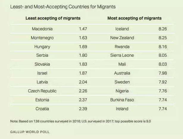 马其顿是最不接受移民的国家,其次是黑山,匈牙利,塞尔维亚,斯洛伐克,以色列,拉脱维亚,捷克共和国,爱沙尼亚和克罗地亚。