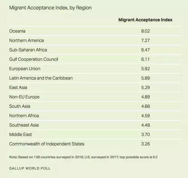 在本次的调查中,世界移民接受指数的平均得分为5.29,77个国家的得分高于这个平均水平,而61个国家得分较低。
