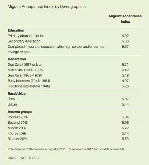 从收入水平来看,最富有的那部分人群,也更有可能接受高等教育的人,与所有低收入群体相比,在接受移民方面也脱颖而出。